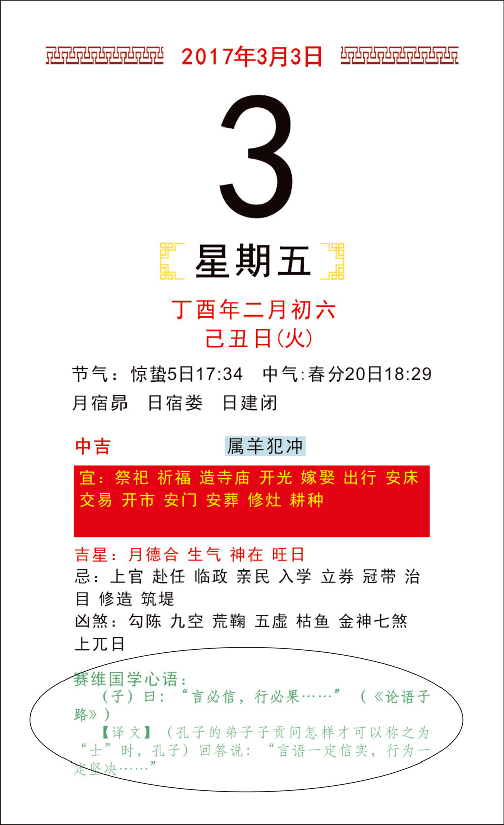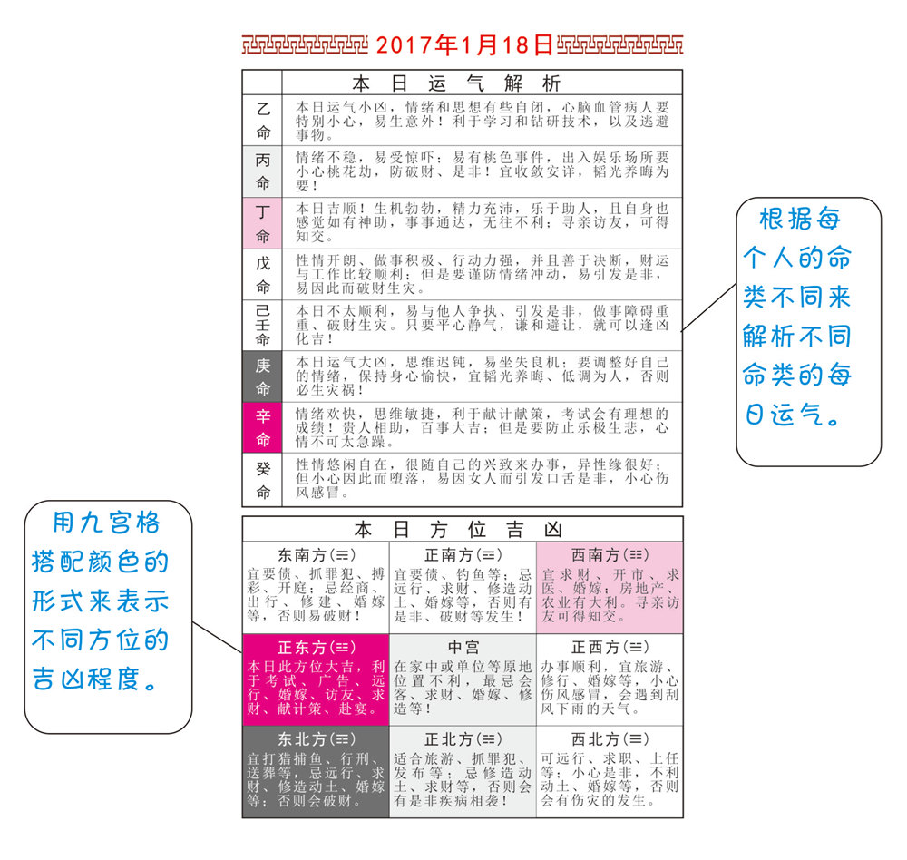 人的出生生肖与流年太岁有着刑、冲、破、害的不利关系,即为犯太岁。无论是犯刑、冲、破、害者,皆会导致官非纠缠、仕途阻滞、投资失利、情绪波动、人事不和及感情离合、严重者有意外血光之灾等情况出现。为此,江东霖大师亲自为本日历配了“2017化太岁符”凡是属鸡鸡年犯太岁化解必备,具有消灾解难保平安作用。