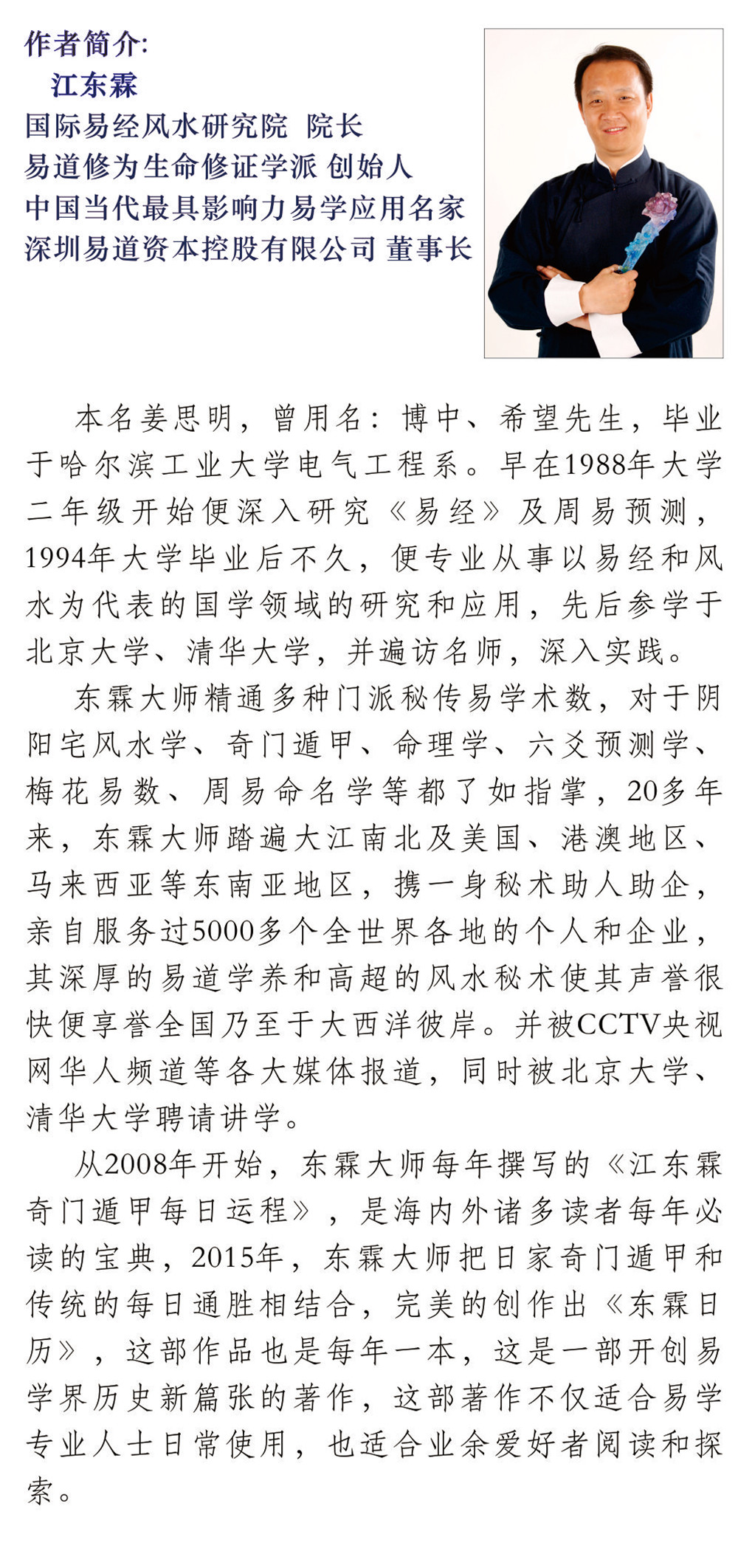 江东霖大师从2008年便开始撰写《江东霖奇门遁甲每日运程》一书,此书完全是根据奇门遁甲预测学而写的,每一天都有一个奇门盘局,一年就需要排365个奇门盘局,其工作量是巨大的。至今已出版第10本,近十年来受到了大批读者的赞扬和鼓励,因为本书对每一位读者都在一定的程度上实现了个性化的预测和指导,给大批爱好者的日常活动带来了指导方向和好运。