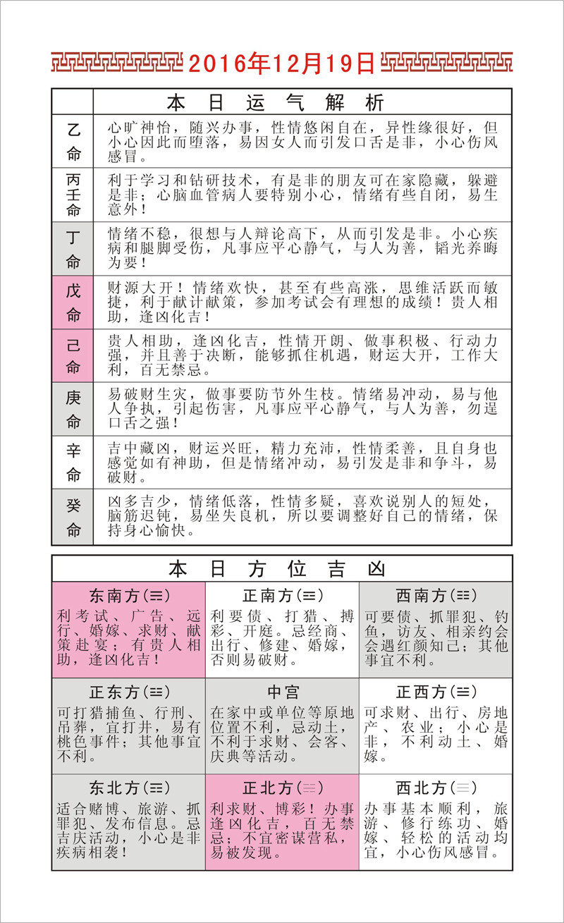 1. 在了解您的每日运程之前,首先要通过《出生时间与命类关系表》按公历出生时间查到您是属于什么年命生人。按照查到的某年命生人,即可在书中查阅您的“本日运气解析”和“本日吉凶方位”。