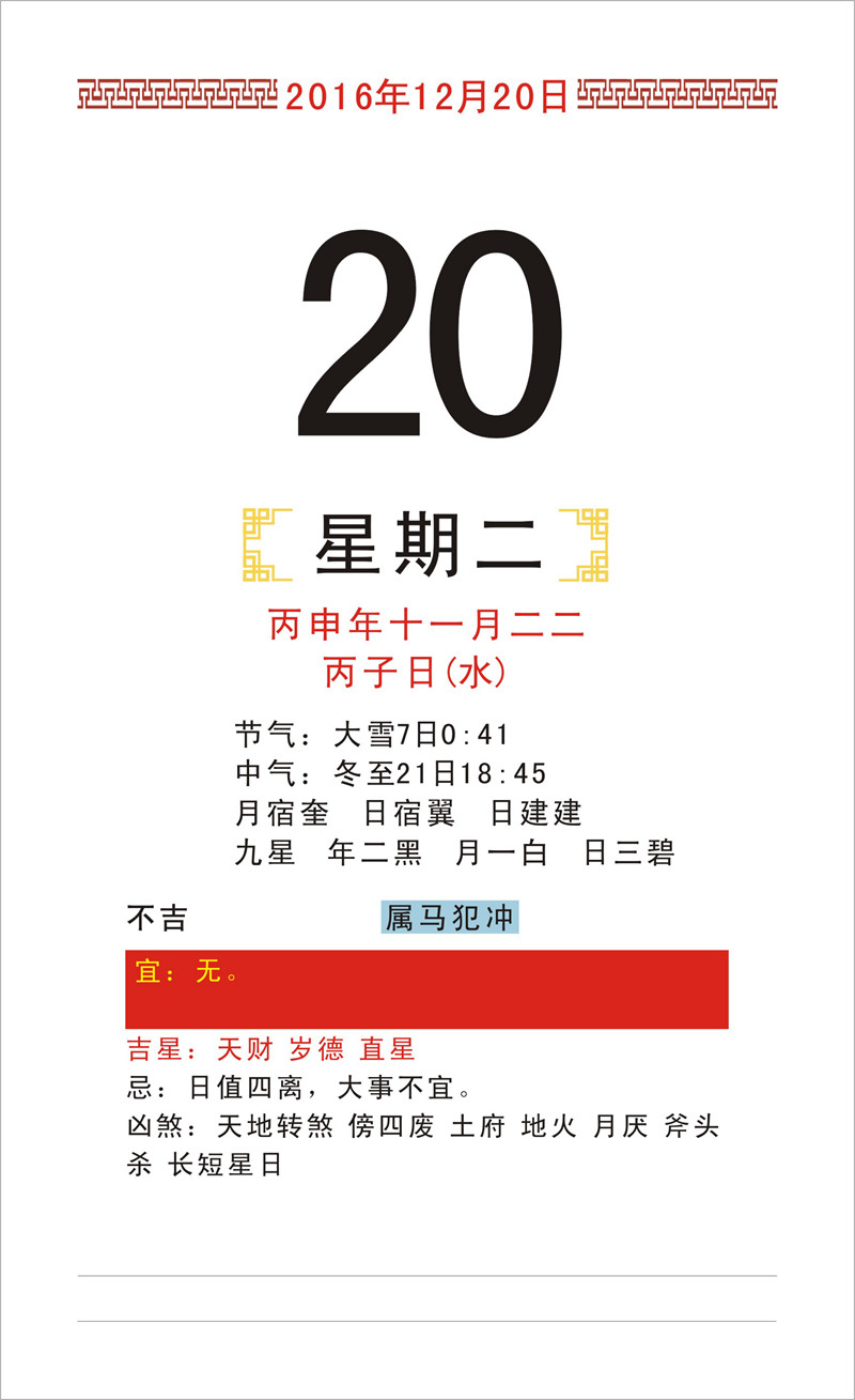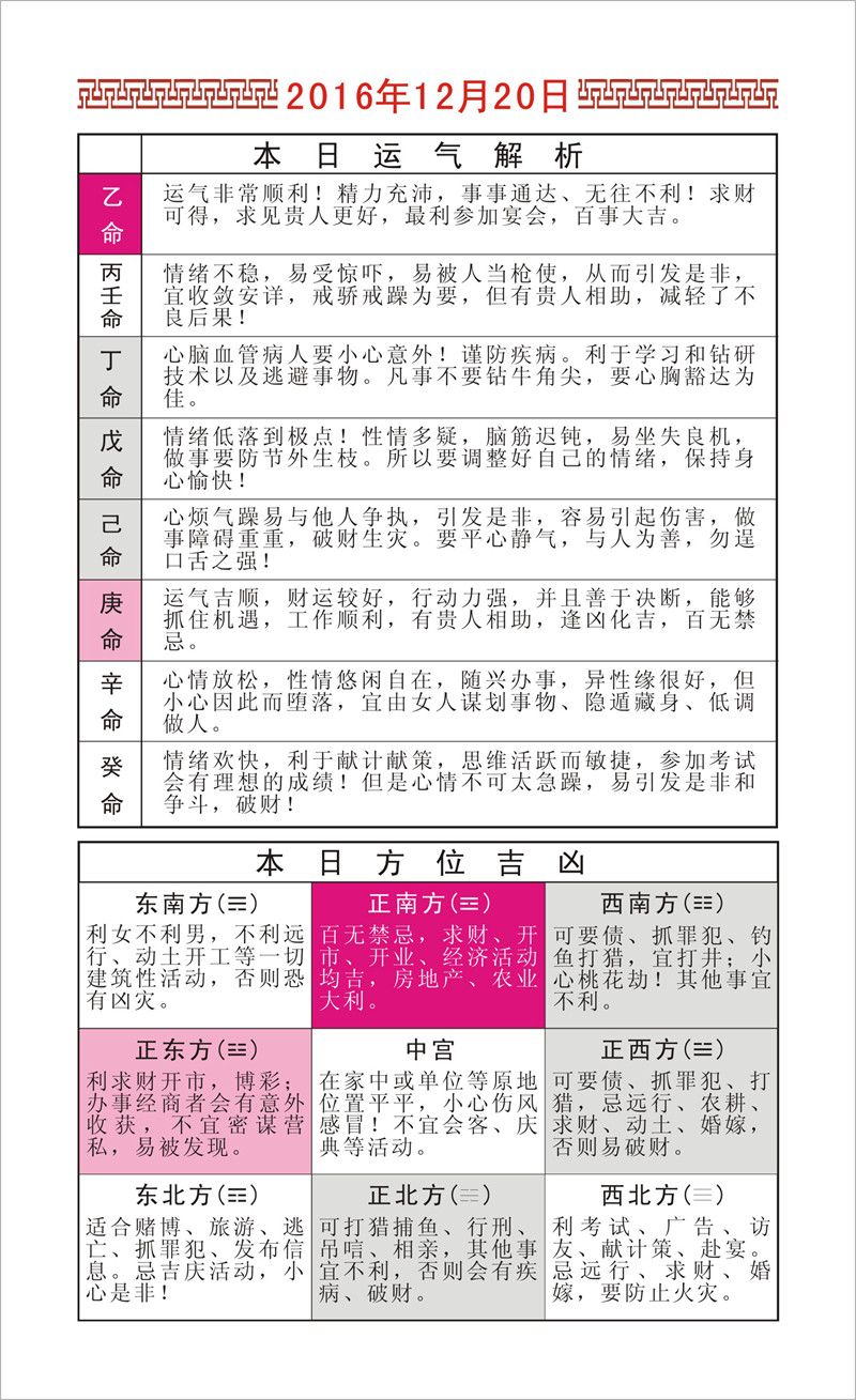 2. 每天的上半部分为“本日运气解析”下半部分为“本日方位吉凶”,用五种颜色样式来表示吉凶程度,如下所示: